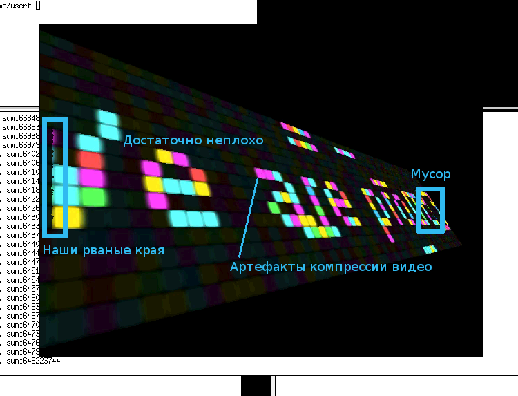 #include #include #include #include #define WIDTH 640 #define HEIGHT 480 #define LUMASIZE (WIDTH*HEIGHT) #define FRAMESIZE (LUMASIZE+LUMASIZE/2) int main(){ uint8_t *prev=malloc(FRAMESIZE); uint8_t *frame=malloc(FRAMESIZE); int q,is_same,same_frames=0; while(1){ if(fread(frame,1,FRAMESIZE,stdin)<=0){break;} is_same=1; for(q=0;q is_same=0;break; } } if(is_same){ same_frames++; } else { if(same_frames>10){ fwrite(prev,1,FRAMESIZE,stdout); } memcpy(prev,frame,FRAMESIZE); same_frames=0; } } return 0; } Сначала компиляем: gcc filter-frames.c Потом запускаем: ffmpeg -i captured_video.mp4 -f rawvideo - ./a.out ffmpeg -s 640x480 -pix_fmt yuv420p -f rawvideo -i - -y filtered.mp4 (предполагается, что исходное видео уже в 640х480, формат пикселя в yuv420p) Таким образом можно легко и просто писать свои фильтры для видео, но не заморачиваться со сложными фреймворками (/спойлер) Итак, наш виртуально-реальный девайс готов, можно приступать к его эмулированию. Если кто не понял - мы создали "виртуальный" экран, с эффектом засветки пикселей и "неизвестным" временем отклика, почти как любой другой реальный экранчик. Теперь самое время его эмулировать! Первым делом я пустил линии по экрану, чтобы получить координаты реальных пикселей: Затем я взял только чистые кадры и попробовал сделать из них маски... Но какой порог выставлять? Как я не старался, но у меня не получалось получить чистые линии. Пришлось писать еще один фильтр на сишке и вычитать из кадра "фон", т.е. состояние, когда все пиксели выключены, получилось очень красиво и ровно: [spoiler] Здесь виден еще один косяк моего "эмулятора" - в то время как "столбцы" имеют выпуклости, "строки" здесь совершенно линейные, что выявляет дефект верстки. Впрочем, для нашего маленького исследования это практически не имеет никакого значения [/spoiler] Этой информации достаточно, чтобы разбить наш экранчик на "спрайты". Пока что это будут только лишь "знакоместа". Просто загружаем все фреймы в память (включая первый, где ничего нет, так как самый первый столбец "уполз" за экран), считаем первые 64 кадра за столбцы, остальные 16 кадров строками, а затем ищем пересечения. Если какой-то пиксель уже участвовал в пересечении, то его не считаем, так как он относится к уже найденному ранее "пикселю". Чтобы было как-то поинтереснее, проиндексируем все в рандомном порядке. Получается такая вот карта: Тааак, надо замазать дырки! А это что тут у нас? Да, я умышленно сделал рандомное наложение, но не мог и подумать, что будет такая вариативность в размерах. Это никуда не годится! Давайте посмотрим, а где эти "пиксели" пересекаются? И опять виден косяк моего HTML-программирования - строчки совсем не смешиваются, зато столбцы - очень даже. Надо бы как-то заполнить эти черные пересечения значениями обоих соседних "пикселей". В идеале, надо бы изобрести какое-то подобие дизеринга или эрозии, но у меня тут за спиной стоят люди с вилами, которые просят уже дописать драйвер. Нельзя подводить команду, потому я использовал самый простой вариант заполнения - рандом, т.е. беру произвольную, но не занятую точку, рядом с ней еще одну точку, и если попал на "пиксель", то копирую ID этого пикселя. Повторить 100000000 раз: WOW! Я сам такого не ожидал! Жаль только, что разброс пикселей слишком велик и там где наши виртуальные пиксели небольшие, некоторые из них перепрыгивают друг через друга. Пришлось уменьшить разброс: Здесь уже нету перескоков, но и эффекта дизеринга тоже почти нет, по сути это и есть стохастическая эрозия. Можно было бы взять кисточку в Gimp и скопировать дизеринг из левой части, не задевая правую, до кучи еще обрезать "подтеки" по сторонам, чтобы не жрали п