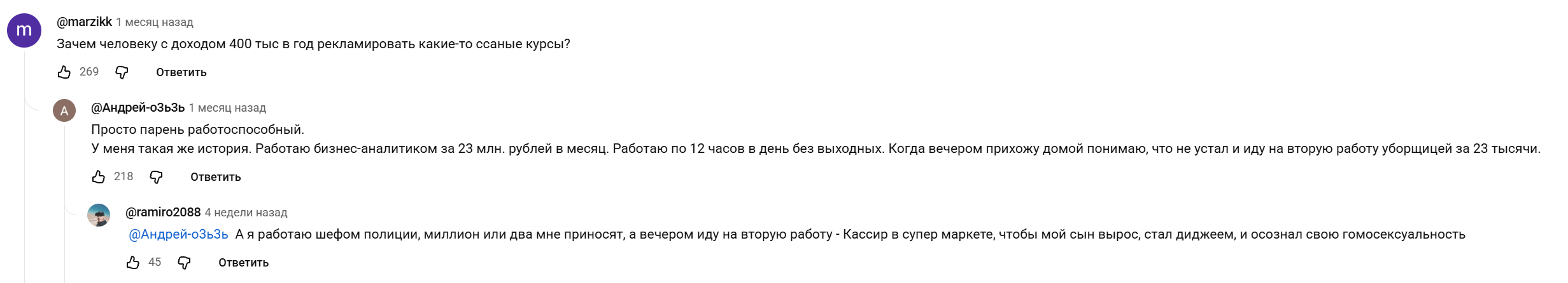 anessueb35f6:Если один Витя может провести деЫчезацию, деФагготизацию, деИндустриализацию и развалить СССР, то кто тогда такие Вы и чего стоят все ваши "ценности" с которыми вы носитесь? На самом деле Витя тут не при чём, он всего лишь маленькая последняя соломинка, которая может переломить спину уже нагруженного верблюда, если ветер кинет её ему на спину последней. Всё это результаты глобальных процессов. Пчёлы куда-то исчезают, никто не знает почему. Мишки остались без мёда и недовольно мурчат. |