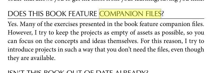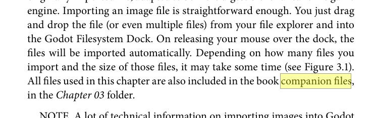 Начал читать учебник по Годоту, дошел аж до 80 страницы где впервые понадобились "приложенные&qu ot; к книге ассеты. Начал искать где их взять - А ИХ НИГДЕ НЕТ. Не в самой книжке ссылки не даётся, ни в гугле не нахожу. <https://put. icu/s/z13u0q4b. png> <https://put. icu/s/eb30vsis. png> Книжка вот эта: <https://www. amazon.com/ Game-Development- Godot-Complete- Introduction- ebook/dp/B0FN6FP3JD> НУ И ГДЕ МНЕ ИСКАТЬ ФАЙЛЫ-КОМПАНЬЁНЫ? |